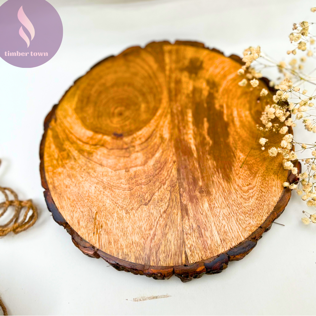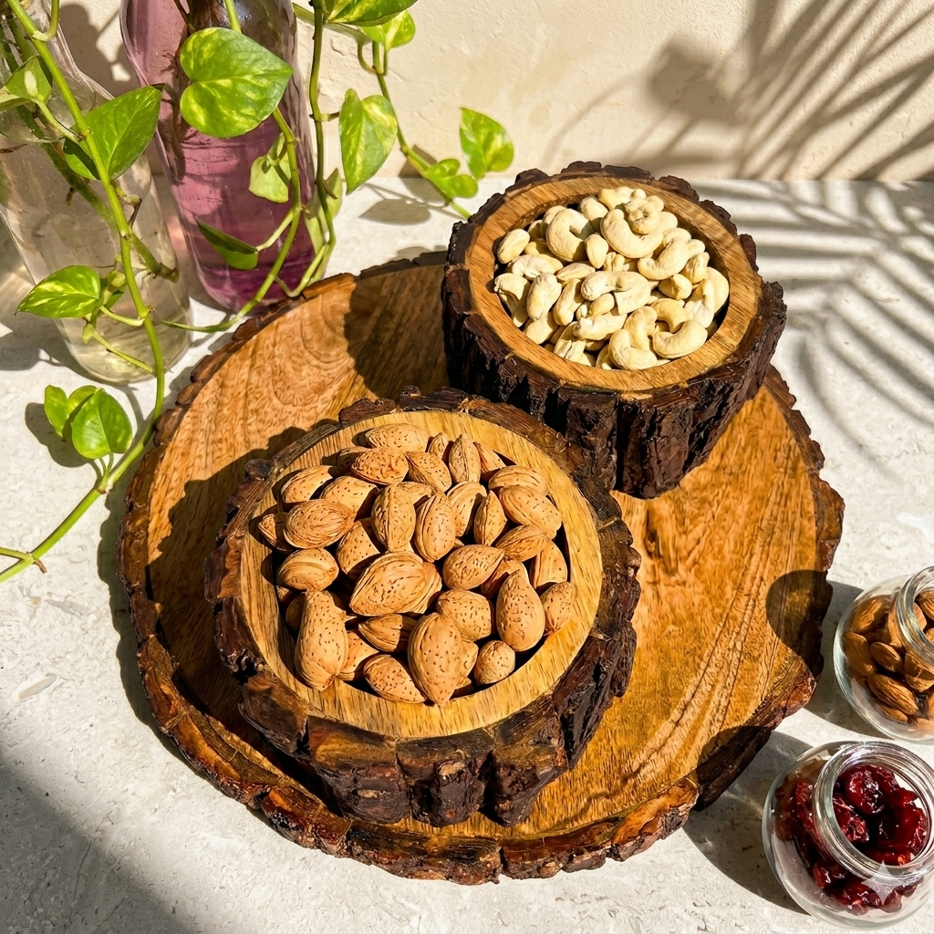 This set includes a beautifully handcrafted wooden platter paired with two rustic mango wood bowls, each finished with natural bark edges that preserve the raw charm of wood. Every piece carries its own unique grain, making your setup truly one of a kind.