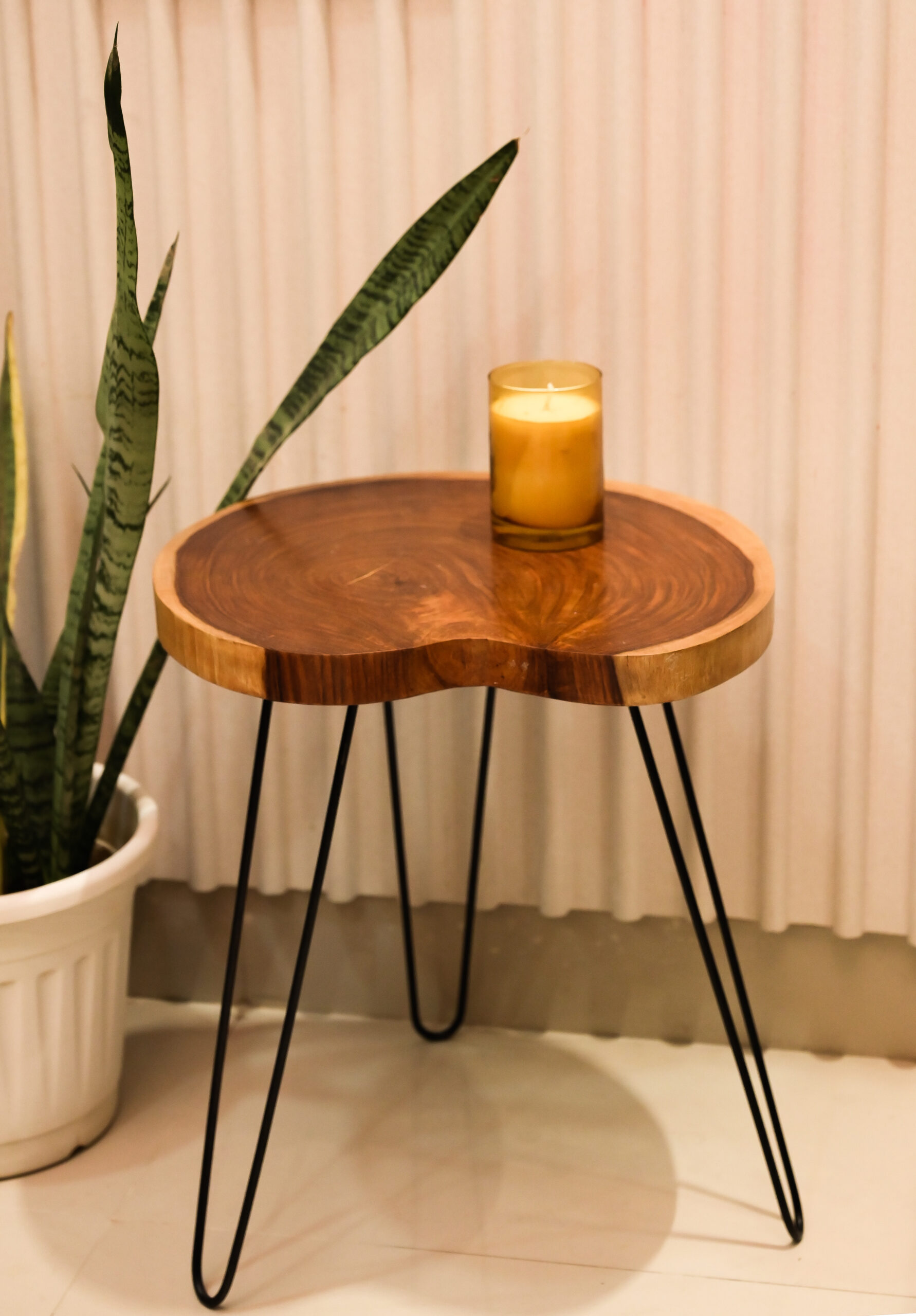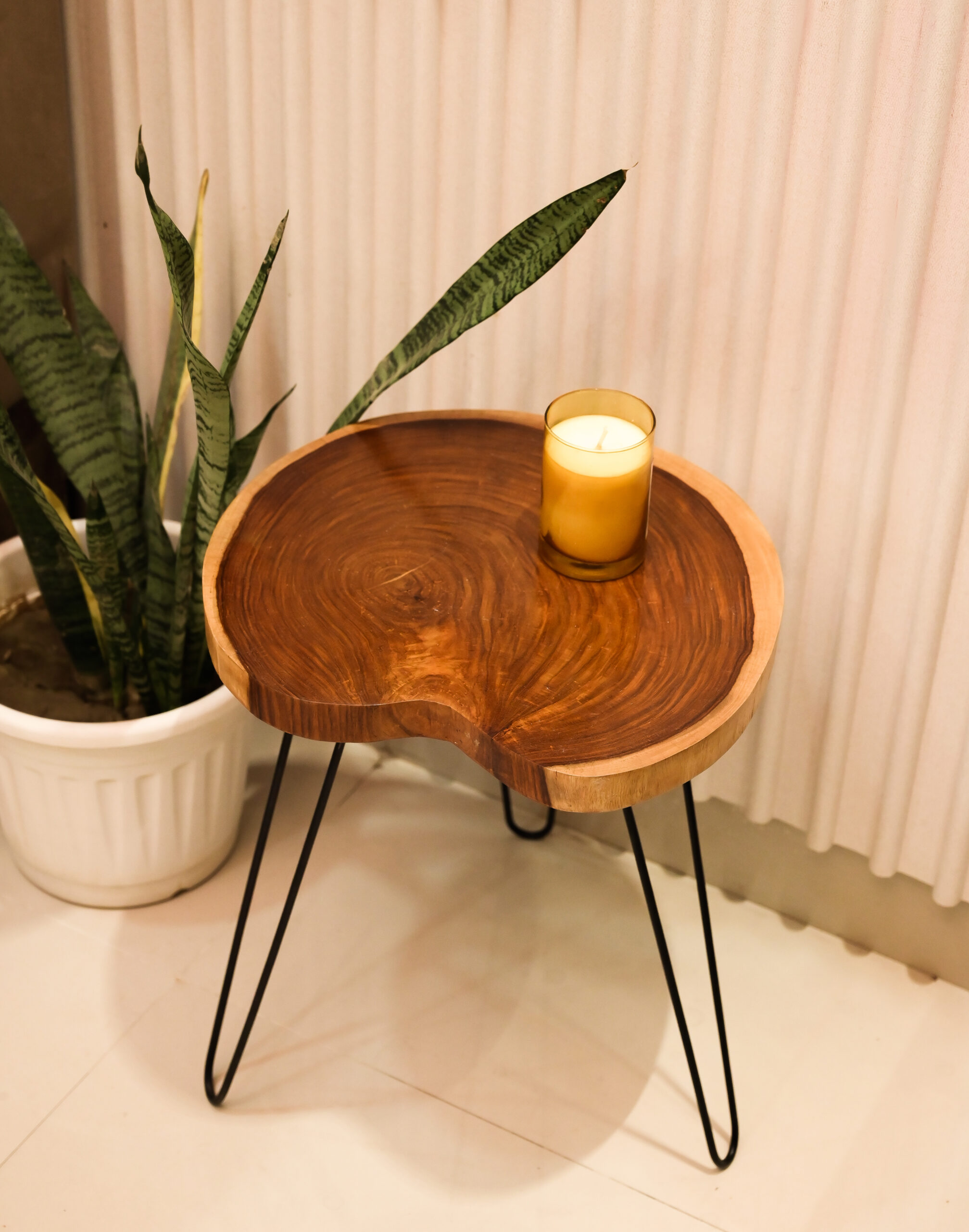 This beautiful wood slab is supported by three sleek, sturdy metal hairpin legs in a matte black finish, providing a striking contrast and a minimalist, mid-century modern feel.